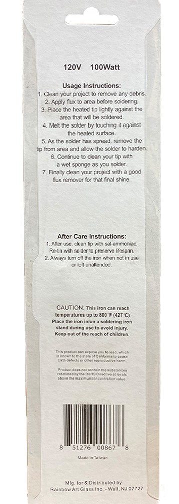 Iron: Value Brand 100 Watt Premium Iron Tip: 1/4" Plated Chisel (#11691) Max Temperature: 800°F Voltage: 110 volt.,